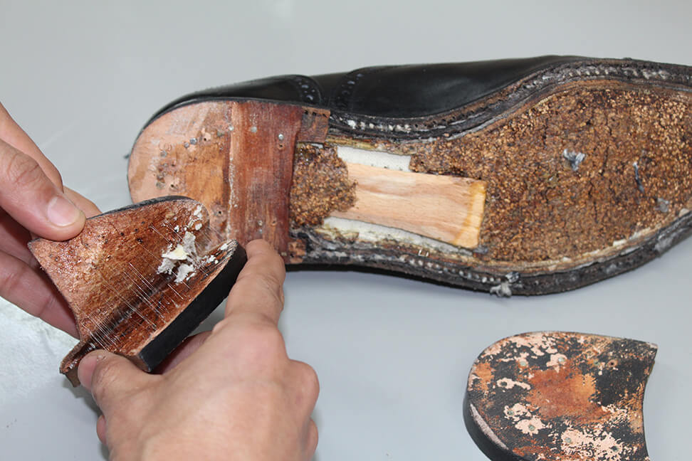 On average, a complete re-soling takes half a day and involves several different cobblers. The team strips off battered soles and replaces with a new protective rubber or leather layer.