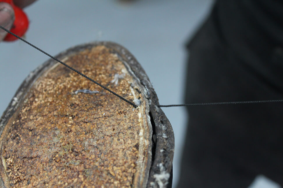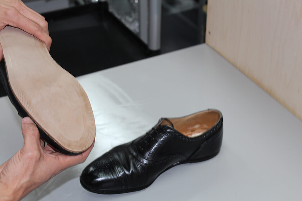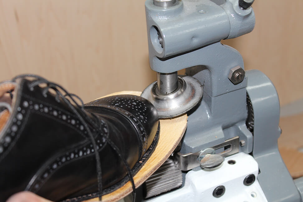 A fresh sole is cut to the exact measurements of the shoe, sewn on and secured into place.